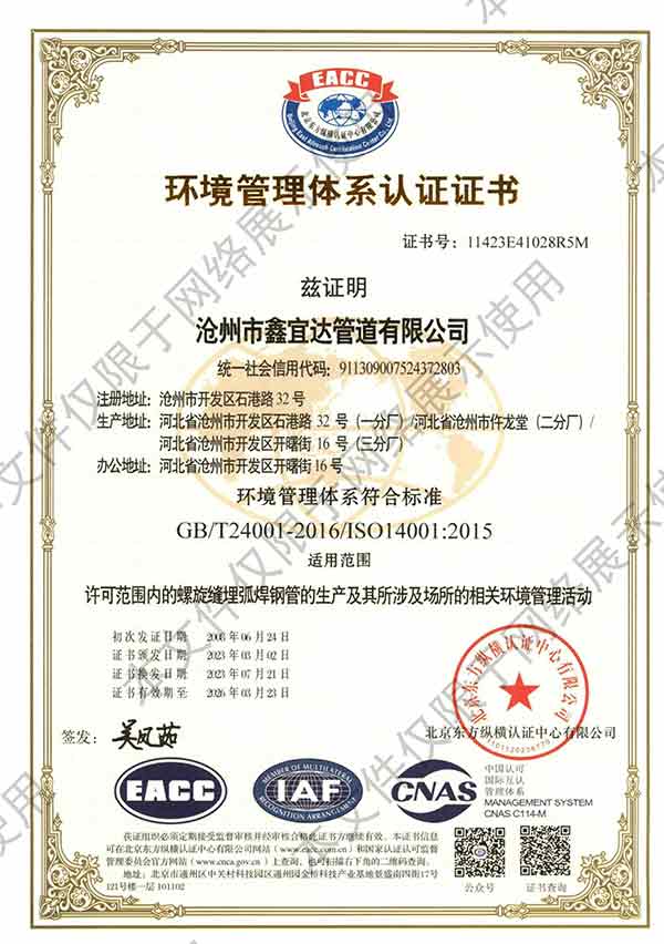 滄州市鑫宜達管道有限公司成立于2003年7月,坐落于滄州經濟開發(fā)區(qū),占地面積40萬平方米,注冊資金1.81億元,是集螺旋鋼管生產、防腐加工以及無縫鋼管、卷板、帶鋼等品類鋼材經營銷售于一體的工貿型企業(yè)。公司現有員工400多人,其中,中高級技術職稱的人員達120余名。 滄州市鑫宜達管道有限公司擁有9條螺旋鋼管生產線和3PE防腐生產線,可生產直徑219--3640mm,壁厚5.5--28mm,最高鋼級X100的各種規(guī)格防腐螺旋鋼管...